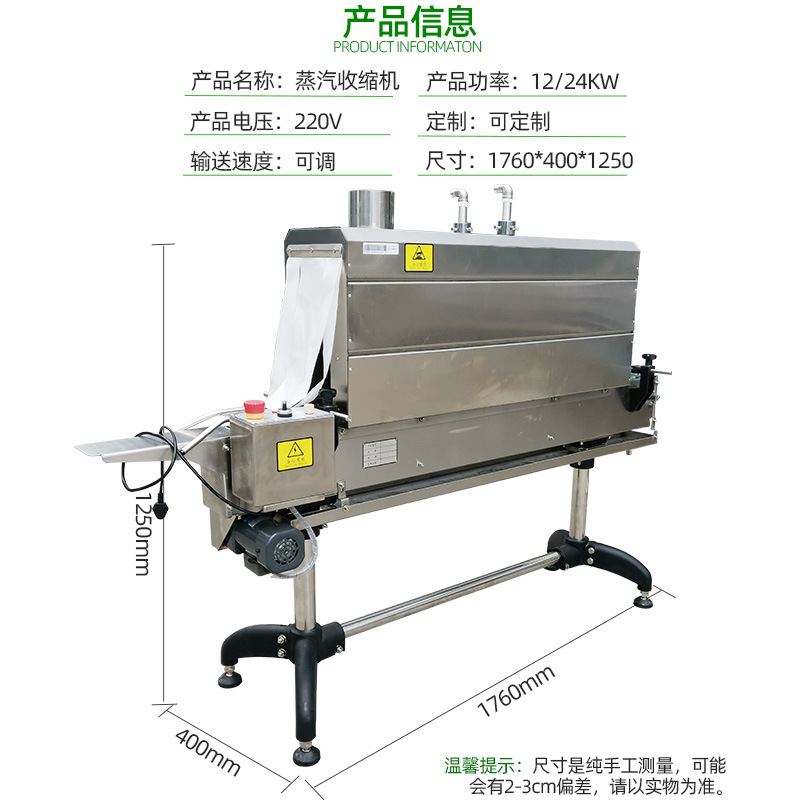 - 可以用于多種包裝材料的收縮,如 PVC(聚氯乙烯)、POF(聚烯烴收縮膜)、PE(聚乙烯)等薄膜。不同的包裝材料有不同的收縮特性,蒸汽收縮機可以通過調整蒸汽溫度、時間等參數來適應這些材料。例如,PVC 薄膜收縮溫度相對較低,POF 薄膜則需要稍高一些的溫度才能達到良好的收縮效果。