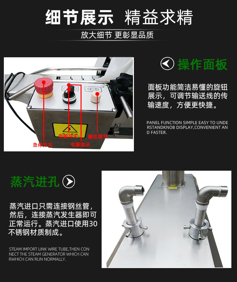 - 相對于一些其他的熱收縮方式(如熱風收縮),蒸汽收縮機在能源利用方面具有一定的優勢。蒸汽的熱量傳遞效率較高,能夠在較短的時間內使包裝薄膜達到收縮效果。而且,在一些采用廢熱回收的蒸汽收縮機設計中,可以進一步提高能源的利用率,減少能源浪費。