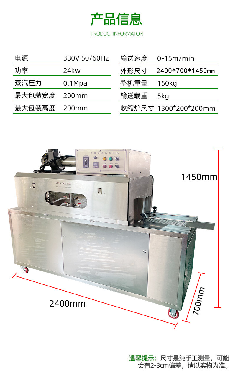 - 減少廢氣排放:與一些傳統的熱收縮設備(如使用燃氣直接加熱空氣的熱風收縮機)相比,蒸汽收縮機的廢氣排放量相對較少。這是因為蒸汽收縮機主要利用蒸汽的潛熱進行包裝材料的收縮,蒸汽在收縮通道內循環使用,只有少量蒸汽在完成熱交換后排出,而且排出的主要是水蒸氣,對環境的污染較小。