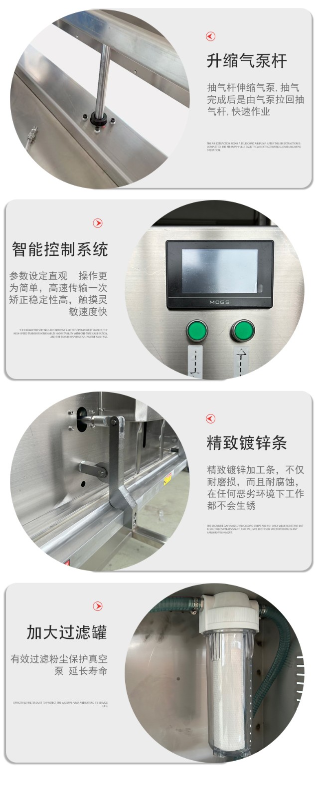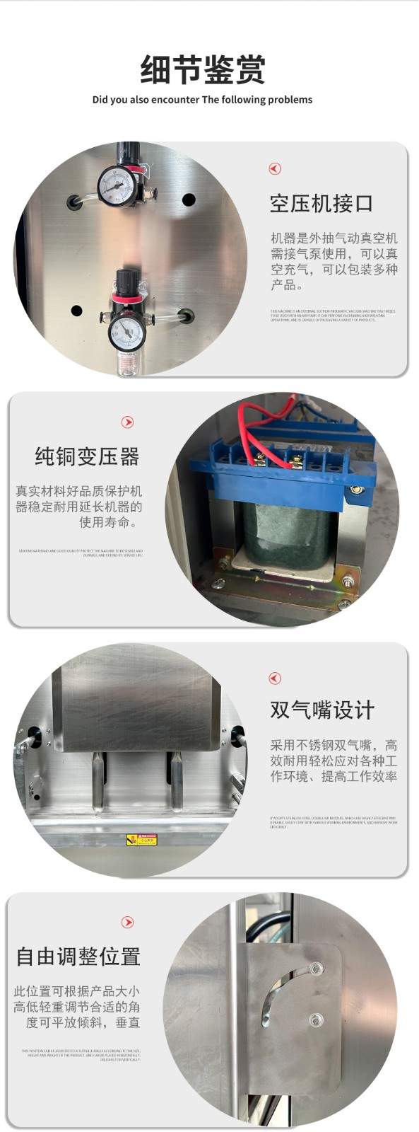 可定制與多模式適配不同尺寸:部分機型支持封口規格定制,封口長度可達到 800mm、1000mm 甚至 1200mm 等,適配不同寬度的包裝袋。同時,部分先進機型預設多組工作模式,可快速切換真空、充氣、封口等流程,適配從小袋糕點到大袋五金模具等不同尺寸、類型產品的包裝需求。