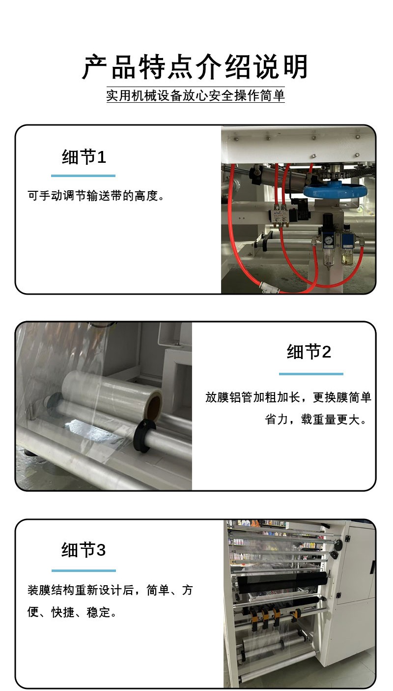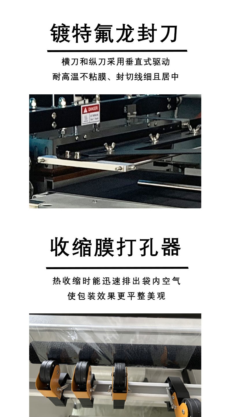 - 封切精度高,包裝成品率優異采用 PLC 可編程控制系統與伺服電機驅動,搭配光電感應定位技術,能精準識別產品尺寸,實現膜料的定長輸送與封切,封口線平整牢固,切口光滑無毛刺,有效避免因封切偏差導致的膜料浪費,成品率可達 99.5% 以上。同時,特制耐高溫鋁合金封刀具備防粘刀功能,適配 POF、PVC、PE 等多種熱收縮膜,杜絕膜料粘連封刀造成的包裝瑕疵。