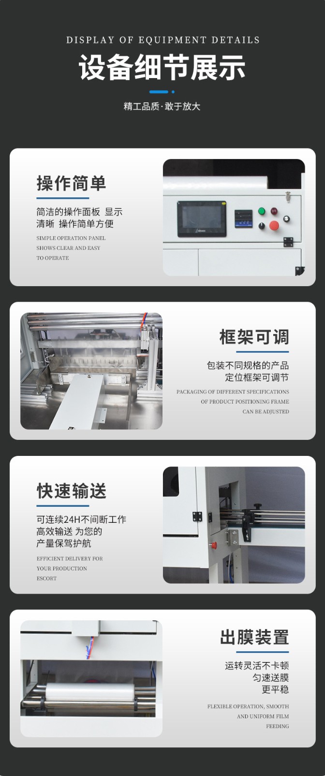 - 機械結構堅固:設備的機械部件采用高質量的材料和精密的加工工藝,結構設計合理,能夠承受長時間的工作壓力。例如,其框架結構穩固,能夠減少設備在運行過程中的振動和晃動,保證套膜動作的準確性。