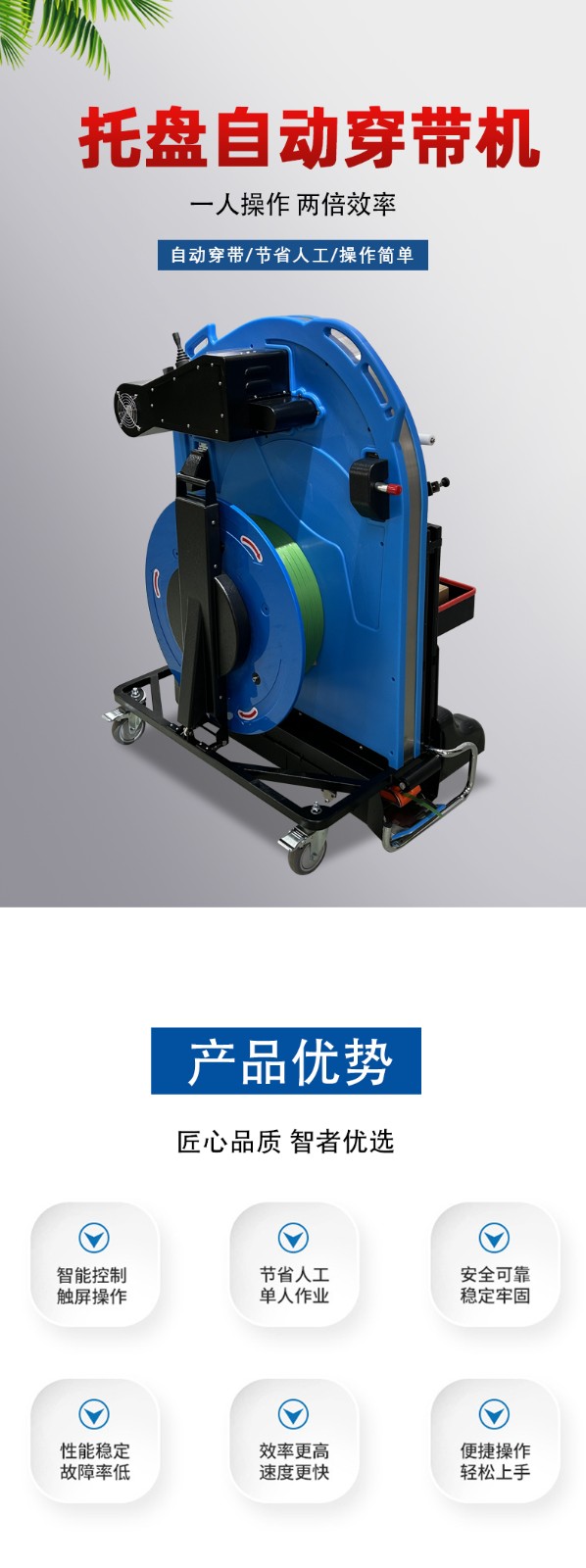 - 穿帶機是一種在包裝流程中起輔助作用的設(shè)備,主要用于將打包帶穿過被包裝物品周圍或包裝結(jié)構(gòu)中的特定位置,以便后續(xù)進行打包操作。它可以被看作是包裝自動化生產(chǎn)線中的一個環(huán)節(jié),能夠有效提高打包的效率和準確性。