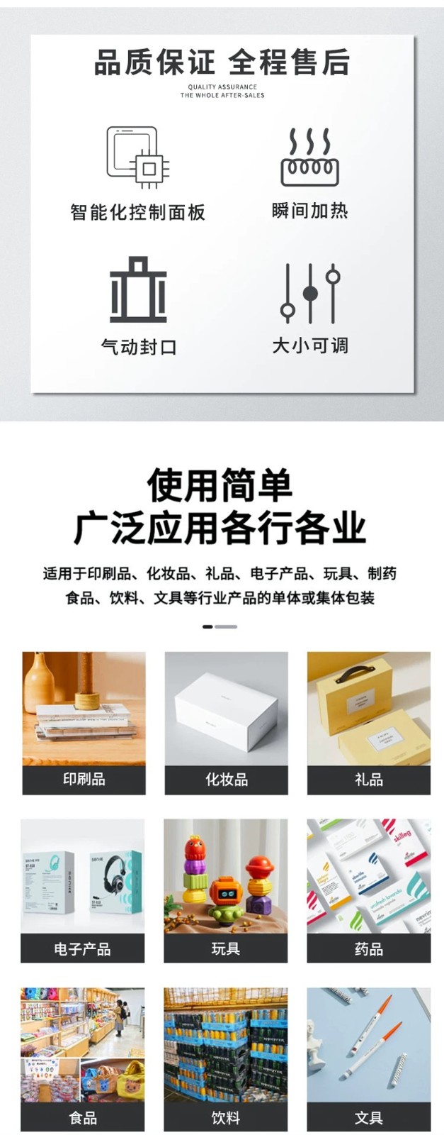 - 電子行業:電子元器件、小型電子產品如手機、耳機、充電器等,需要防潮、防靜電的包裝環境。該設備可使用防靜電塑料薄膜對電子產品進行包裝,在保護產品的同時,提供良好的外觀展示