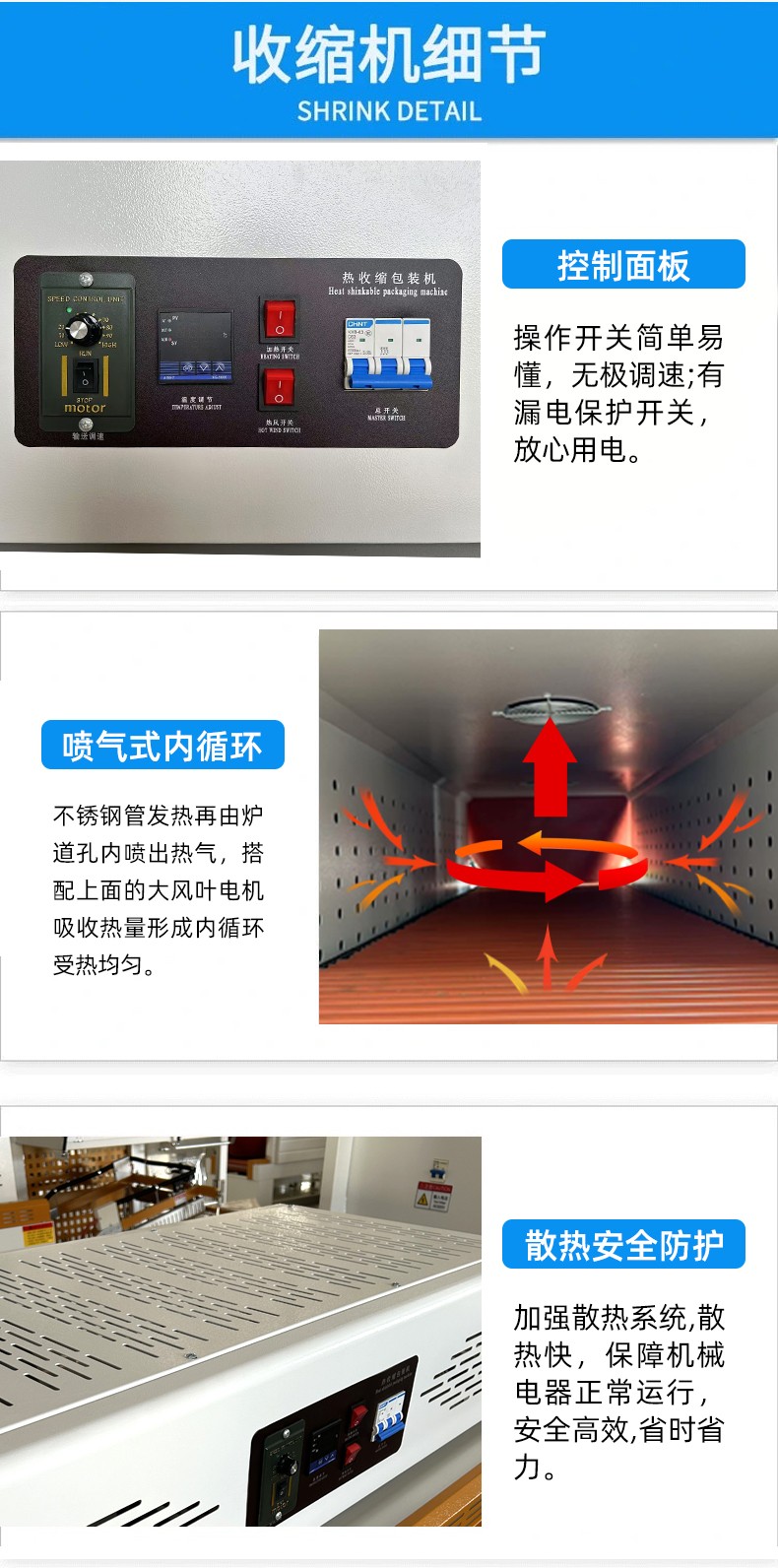 - 熱收縮效果佳:熱收縮通道內的溫度分布均勻,熱風循環系統設計合理,可使塑料薄膜均勻收縮,緊密貼合產品,展現產品的外觀特征,同時起到防潮、防塵、防碰撞等保護作用。