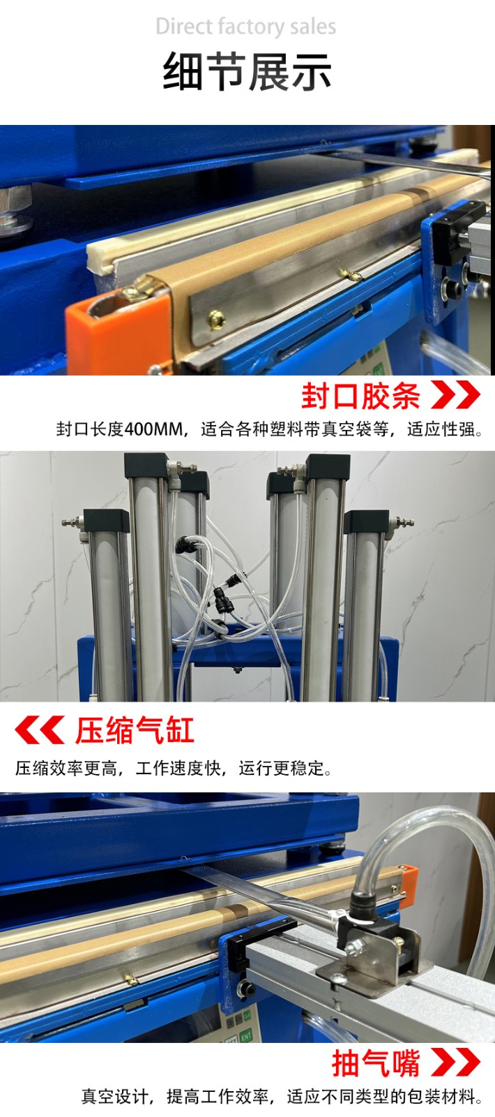 - 壓縮(部分機型):一些真空壓縮封口機在抽氣后會利用氣缸等裝置對包裝袋進行壓縮,進一步排出袋內空氣,使被包裝物更加緊實,減小包裝體積。