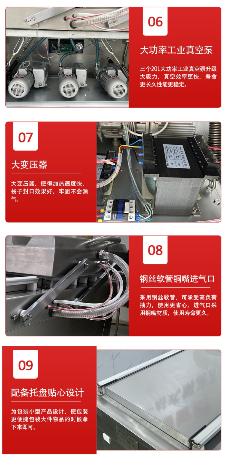 - 同一時間,右室真空蓋保持開啟,操作人員可同步將下一批待包裝產(chǎn)品放入右室包裝袋并擺好(即 “裝袋準(zhǔn)備”),無需等待左室流程結(jié)束 —— 此時左室 “忙” 于抽真空密封,右室 “閑” 于裝袋,兩者并行不沖突。